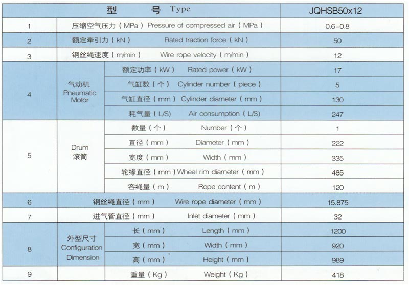 JQHSB50x12氣動(dòng)絞車,采用壓縮空氣為動(dòng)力,推動(dòng)TMH17活塞式氣動(dòng)馬達(dá)工作。再通過二級(jí)齒輪減速,把扭矩傳給滾筒。氣動(dòng)絞車的操縱,是靠馬達(dá)體上的手操縱轉(zhuǎn)向閥實(shí)現(xiàn)正轉(zhuǎn)、反轉(zhuǎn)、停止等項(xiàng)動(dòng)作。為保證氣動(dòng)絞車的安全性,該氣動(dòng)絞車還具有手、腳雙重剎車功能。特別適用于礦山、建筑工程以及海上、陸地油田鉆井平臺(tái)上使用。