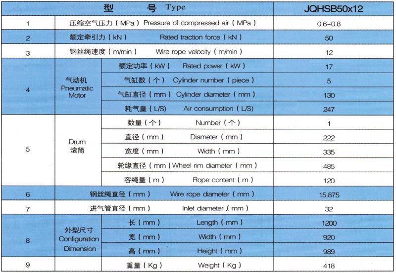 JQHSB50x12氣動絞車.采用壓縮空氣為動力,推動TMH 17活塞式氣動馬達(dá)工作。再通過二級齒輪減速.把扭矩傳給滾筒。 氣動絞車的操縱,是靠馬達(dá)體上的手操縱轉(zhuǎn)向閥實(shí)現(xiàn)正轉(zhuǎn)、反轉(zhuǎn)、停止等項(xiàng)動作。為保證氣動絞車的安全性,該氣動絞車還 具有手、腳雙重剎車功能。特別適用于礦山、建筑工程以及海上、陸地油田鉆并平臺上使用。